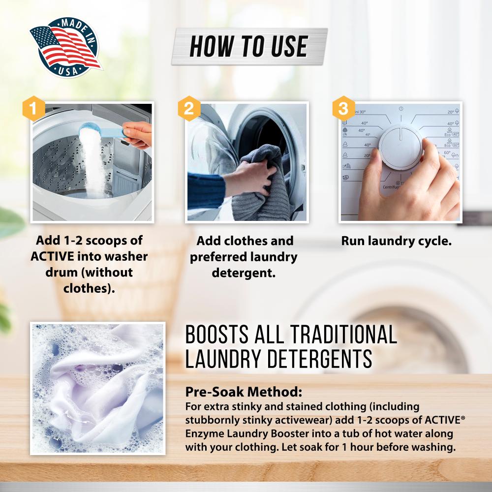 - Add 1-2 scoops of ACTIVE Enzyme Laundry Booster directly into the washer along with your detergent before adding clothes.
